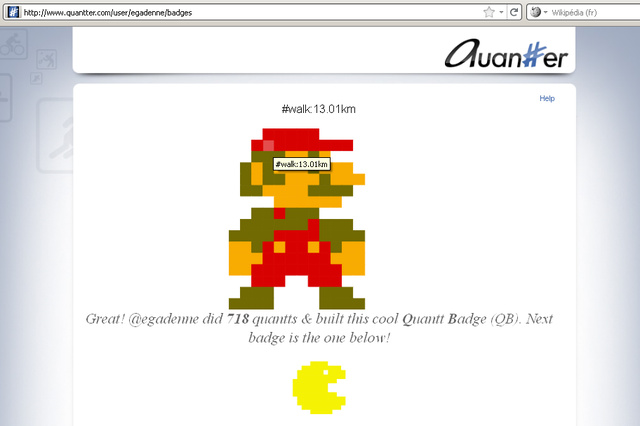 Bien-sûr, il existe une grande dimension ludique. Parmi les membres du groupe QuantifiedSelf Paris, citons Kat Legendre qui cherche des partenaires pour explorer collectivement Wii Fit. Autre exemple avec Quantter qui permet de gagner des badges à chaque fois qu'un certain nombre d'efforts ont été capturés et partagés. La gamification c'est un excellent ressort pour encourager chacun à poursuivre ses efforts. La dimension ludique entraîne détente et motivation. Elle permet même dans certains cas de dédramatiser, par exemple pour un régime alimentaire imposé ou pour une rééducation.