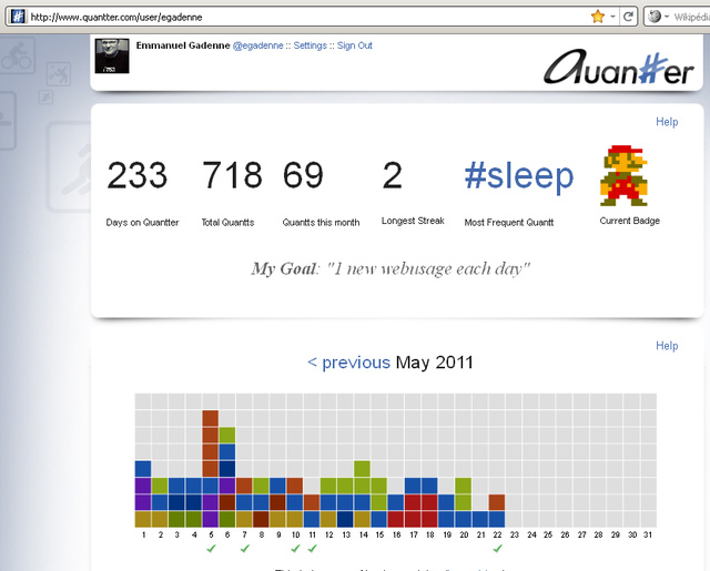 Emmanuel nous propose une visite guidée pour comprendre les usages et les enjeux de cette auto-numérisation de l'individu, et si comme moi cette visite vous intrigue, vous pourrez continuer l'exploration à la première rencontre du groupe QuantifiedSelf Paris le vendredi 10 juin 2011.