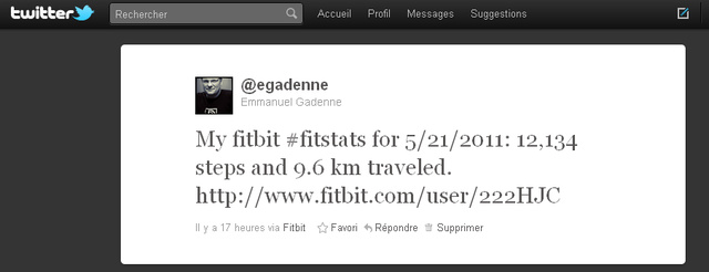 C'est pour cette raison que les différents outils de QuantifiedSelf vous permettent de partager vos efforts sur Facebook, Twitter, etc. Pour éviter la surabondance de messages certains outils comme Fitbit proposent de n'envoyer sur les réseaux sociaux qu'un message par jour ou par semaine.